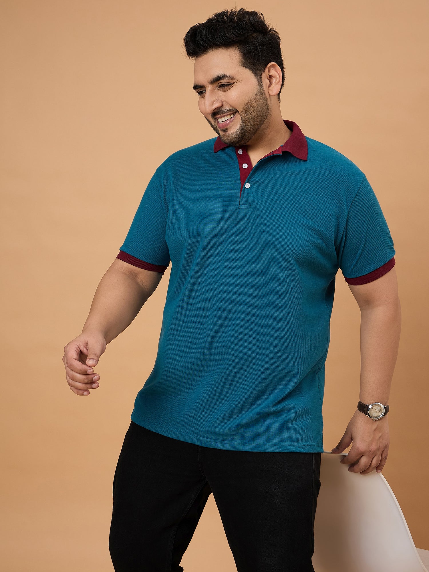 Blue Solid T-shirt, has a polo collar, and Half sleeves.