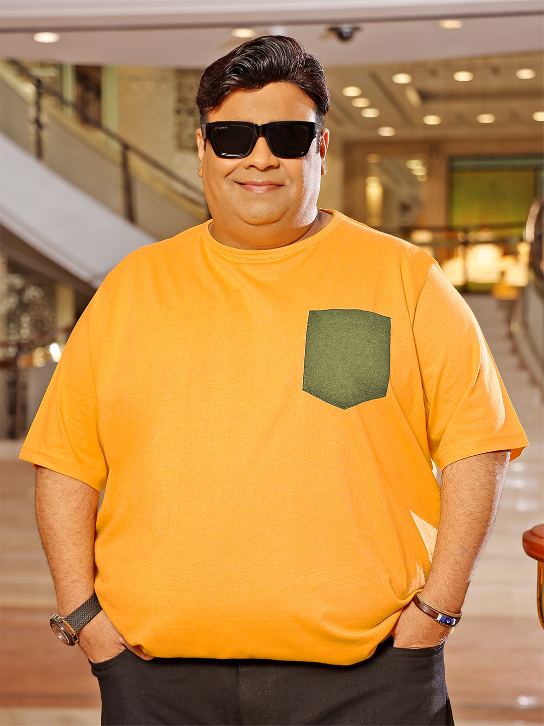 Mustard yellow solid T-shirt, has a round neck, short sleeves, and 1 pocket, Bio Finish.